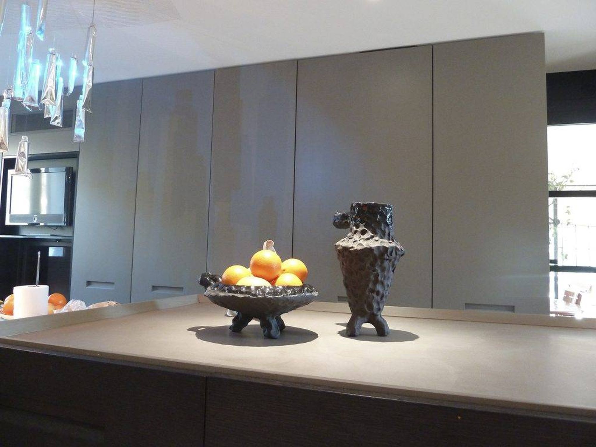 Le choix du mobilier et des luminaires, au même titre que la combinaison du chêne teinté graphite et de la pierre grise, s’inscrit dans une intention moderne et exclusive à l’image de la suspension Ingo Maurer qui coiffe la grande table prolongeant l’îlot central.