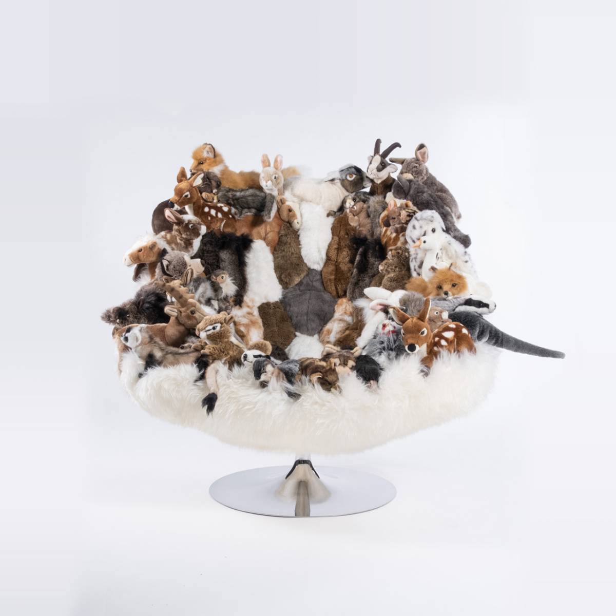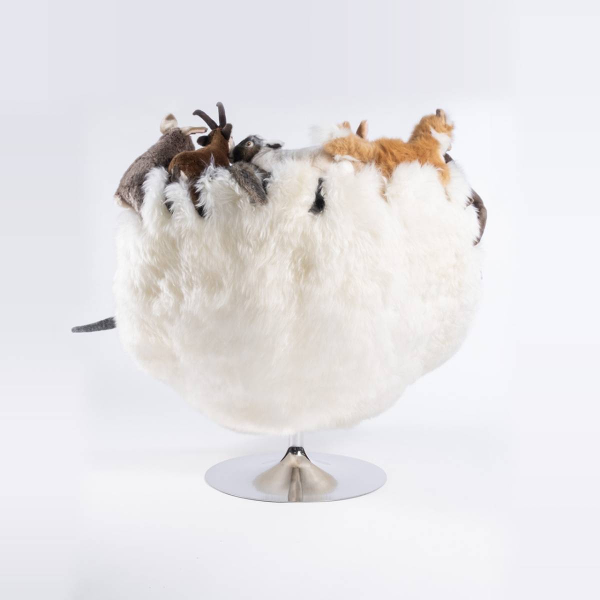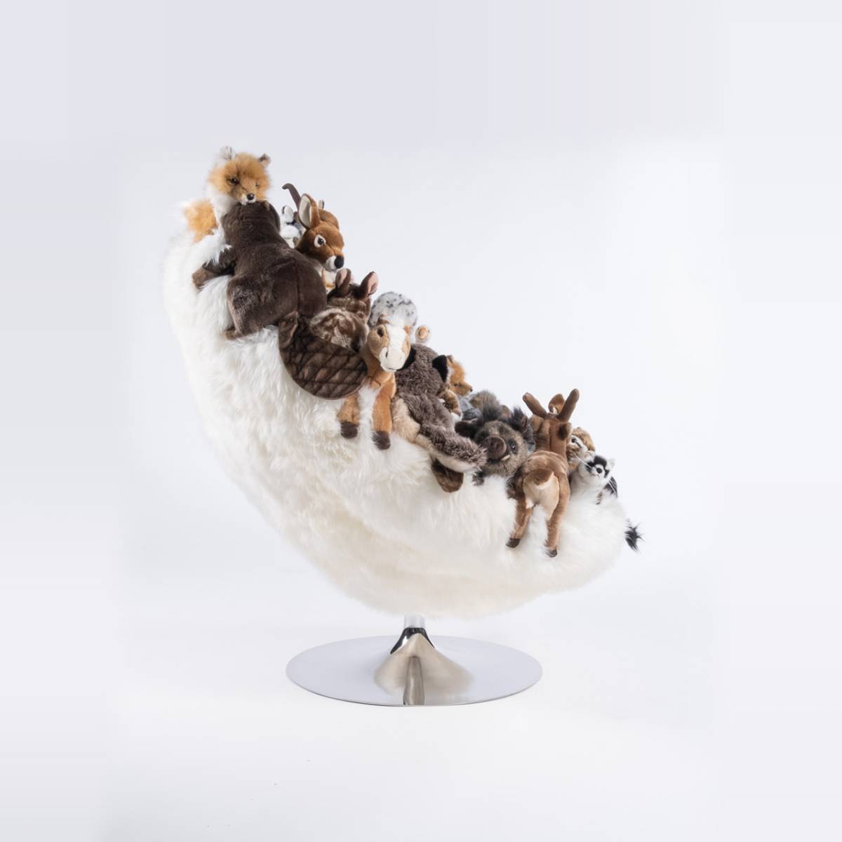 L'Alpin Chair de AP Collection, édition limitée, est une pièce unique fabriquée à la main en Belgique. Ce fauteuil allie confort et originalité grâce à sa structure en acier recouverte de peau de mouton naturelle et d'applications en peluches polyester, créant un design à la fois ludique et luxueux.