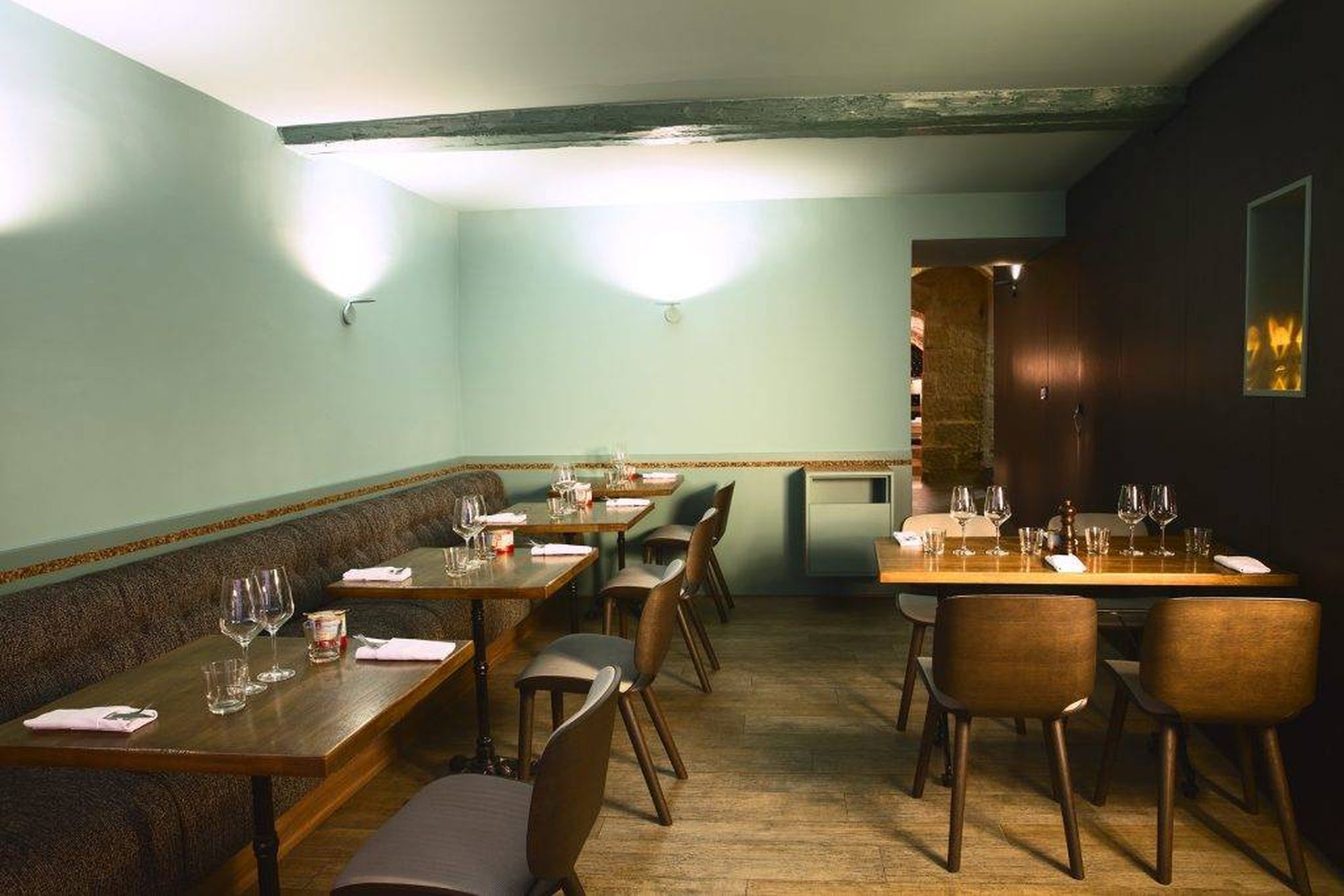 L’agence a repensé l’aménagement complet du restaurant de sorte à harmoniser le lieu à la qualité de la prestation : rénovation du restaurant en mariant des matériaux purs et bruts comme le chêne et l’inox, agencement de la cave à vins en conjuguant espace de dégustation et salle de restauration, ameublement…